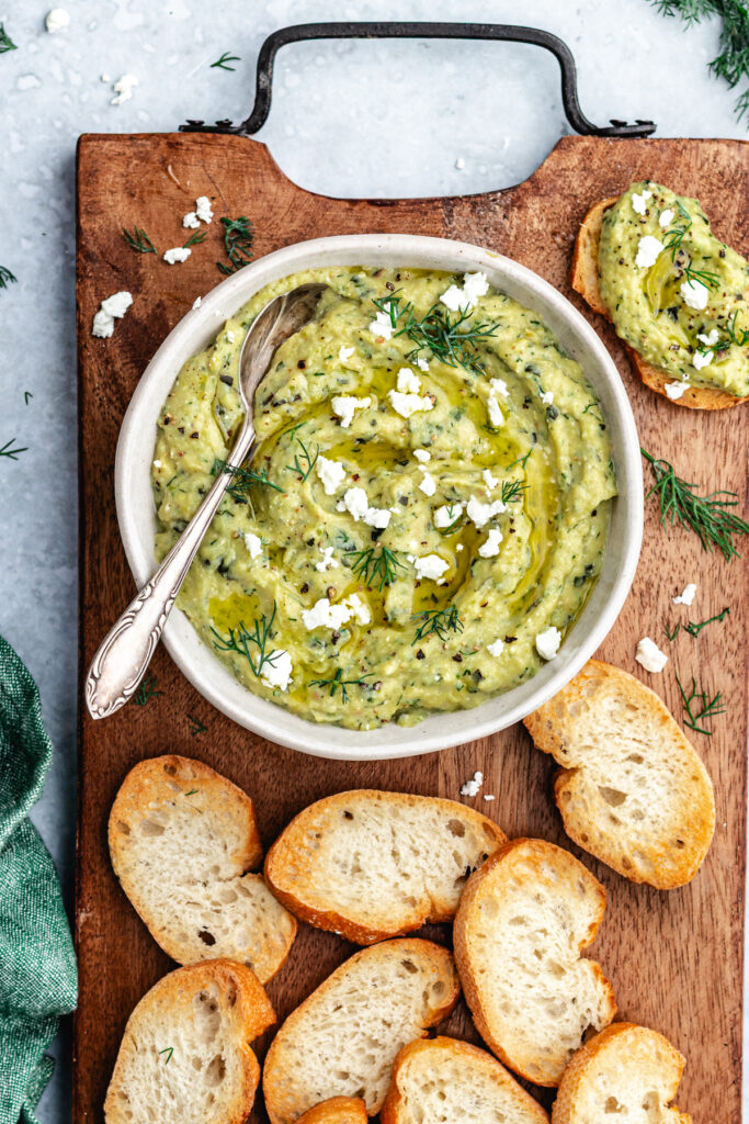 Add the dip to a small bowl and top with a drizzle of olive oil, fresh dill and some crumbled feta cheese. Serve with toasted baguette slices, crackers or vegetables sticks.